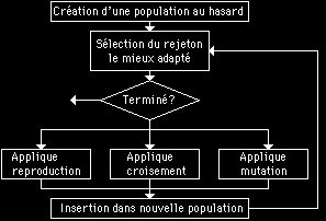 EvolveL'objet Evolve est conçu d'après l'algorithme génétique conventionnel. Il produit des rejetons (de nouvelles listes) à partir d'une liste initiale de nombres entiers. L'usager choisit quel rejeton il préfère (la fonction de sélection du mieux adapté ne fait pas partie de l'objet) et de nouveaux rejetons sont générés à l'aide des fonctions de reproduction, de mutation et de croisement.
